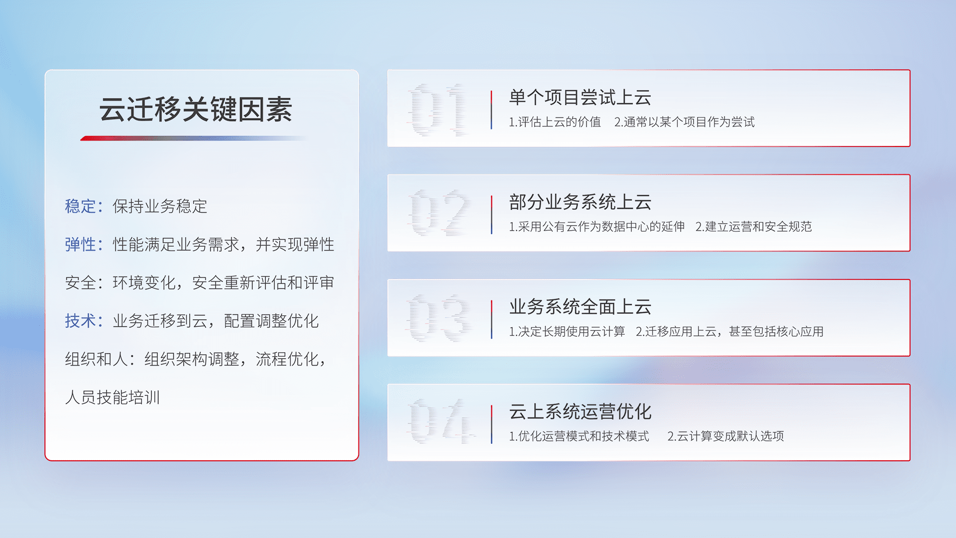 结合实际业务,,从规划设计、、、云平台选型、、、、云原生改造、、数据迁移、、、、集成交付,,,,迁移全过程为客户识别最佳上云路径,,,,做好风险识别管理,,,,设计网络架构、、、、身份权限、、、、安全审计合规、、、、操作审计、、、日志审计、、监控告警策略、、多站点容灾设计等,,,,对云上基础设施进行整体规划,,,,提升IT治理水平,,以满足弹性、、、、高可用、、、、高性能的需求。。